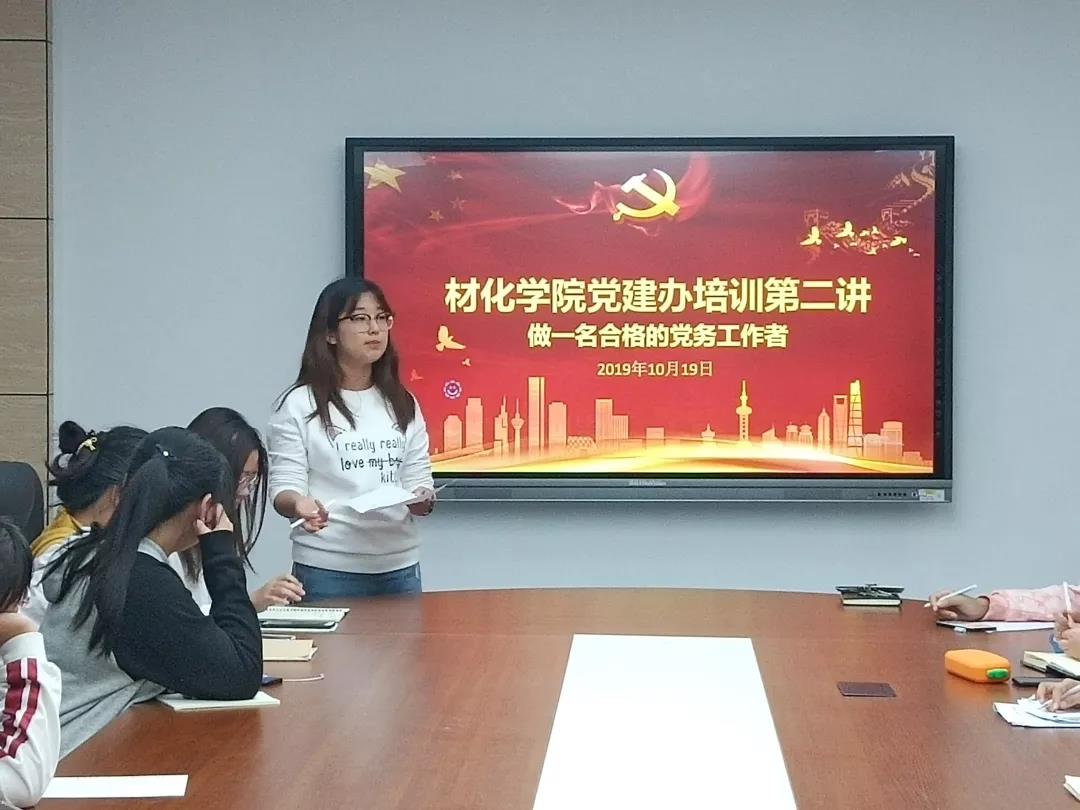 材化学院党建办分别于2019年10月19日、10月26日和11月2日在未来城校区材化楼317开展了主题为“不忘初心、牢记使命”的党建办骨干培训课程第二、三、四讲,主讲人分别为党建办公室副主任林士君、党建办综合事务部部长魏梦贞以及党建办新闻宣传部部长李旭瑶。