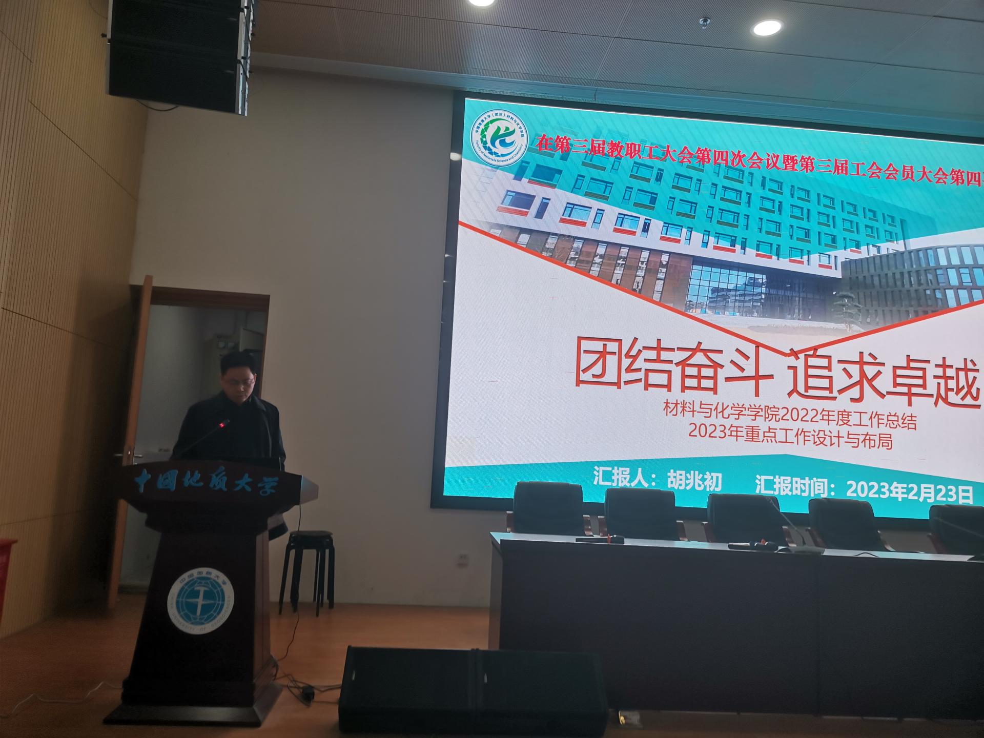 院长胡兆初同志作题为《团结奋斗,追求卓越》的2022年度学院工作报告。报告全面总结了材化学院一年来的工作成绩,从筑牢党建思政生命线、夯实人才培养根基、持续聚焦科研创新、全力改善服务保障等四个方面对2022年的工作进行了回顾,胡院长总结了一年来在持续推进教育教学改革、培养一流本科人才、加强学科及学位点建设、优秀人才引进、重点项目突破、加强科研团队及平台建设、加强实验教学及日常管理、加强实验室安全管理等方面取得的成绩,并对2023年的重点工作进行了部署,号召全院教职工共同努力,使学院各项工作再上新台阶。
