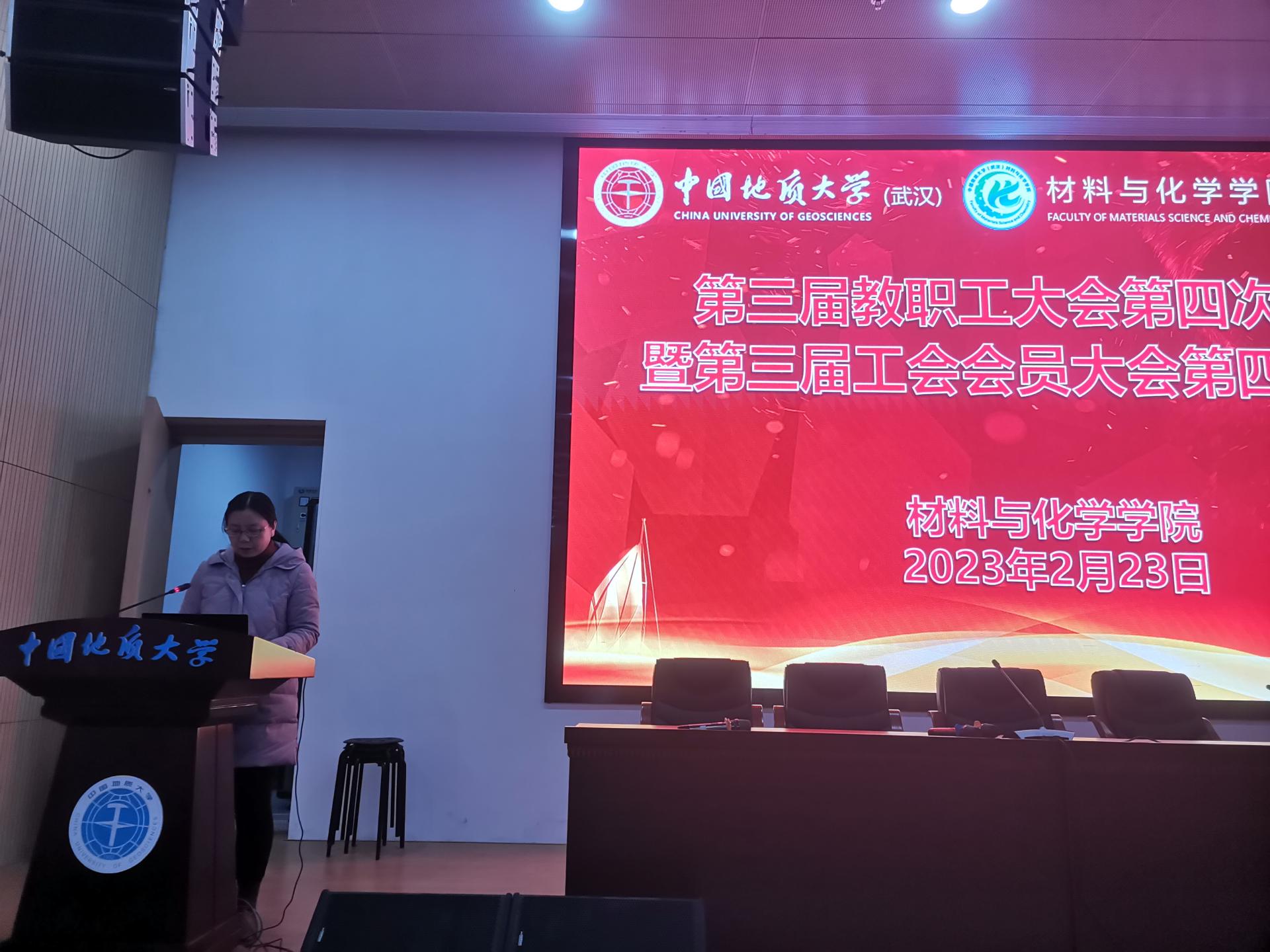 2023223日下午,材化学院第三届教职工大会第四次会议暨第三届工会会员大会第四次会议在未来城校区科教五110会议室隆重召开。大会在雄壮有力的国歌声中开始。材化学院副书记余江涛同志主持会议。